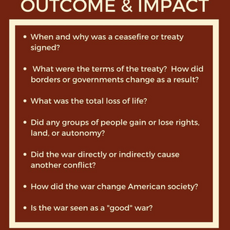 I thought about the major themes of warfare and the big ideas that I wanted them to get out of the unit. Instead of teaching the wars in the order that they happened, now, they learn about many of them simultaneously through the themes of “causes and context “ “battlefield” “leadership” “home front”, and “outcome and impact”. With each theme, students are broken up into small groups, with each team becoming the experts on a different American war. Then, they teach one another what they have learned and compare and contrast each war.
